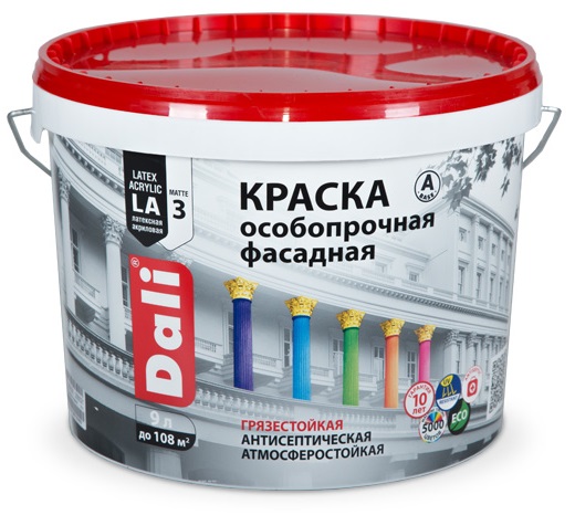 Краска фасадная акриловая для фасадов зданий и сооружений, требующих частого обновления.