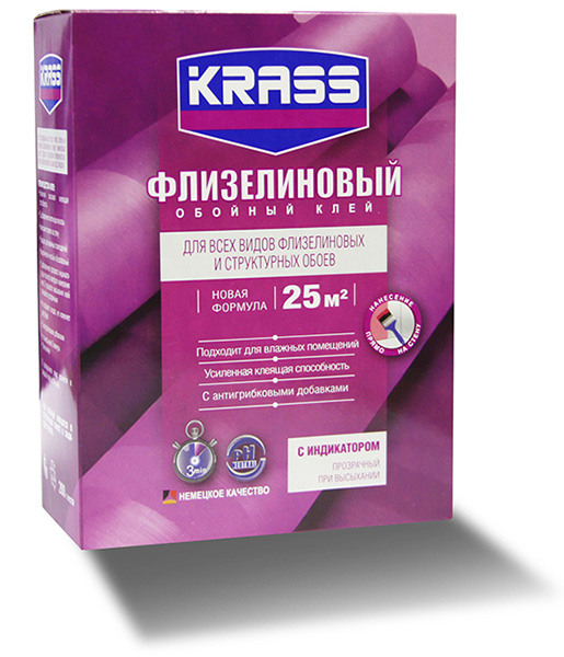 Налить в емкость необходимое количество холодной воды. При постоянном помешивании высыпать содержимое пакета тонкой струйкой ближе к краю емкости. Перемешивать раствор в течение 3 минут до однородной массы. Оставить на 10-15 минут, затем снова перемешать. Клей готов. Подготовить полотно, равное высоте стены, добавив по 5 сантиметров сверху и снизу. Нанести клей кистью или валиком прямо на стену, распределяя его равномерным слоем. Наклеивать полотна непосредственно на стену, от верха, разглаживая приклеенные обои сухой чистой щеткой или тряпкой от центра к краям, удаляя пузырьки воздуха. Обрезать после высыхания излишки обоев по плинтусу. Следующие полотна наклеивать встык.Очистка инструмента – тёплой водой. Окрашивание обоев под покраску производить не ранее, чем через 24 часа.