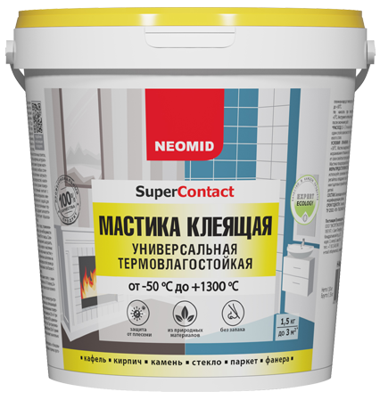 Мастика клеящая универсальная термовлагостойкая (высохший клеевой шов выдерживает температуру от -50°С до +1300°С) «NEOMID» предназначена для кладки и облицовки печей и каминов, склеивания кафельной и метлахской плитки, стекла, пенополистирольных потолочных плиток, дерева, картона, бетона, кирпича, натурального и искусственного камня (кроме материалов на гипсовой основе) в любых сочетаниях, неглубокой шпатлевки оштукатуренных и бетонных поверхностей, наклеивания фанеры на стяжку (кроме поверхностей, имеющих постоянный контакт с водой).
