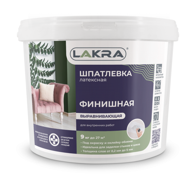 Высококачественная, готовая к применению, шпатлевка на основе водной дисперсии акрилового латекса, имеет высокую адгезию к основанию, стойкость к растрескиванию и малую усадку. После высыхания отлично шлифуется.