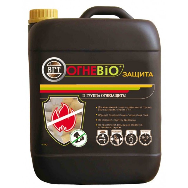 Состав для огнезащиты и антисептирования древесины для внутренних работ и фасадов, защищённых от прямого попадания воды. Обеспечивает II группу огнезащитной эффективности по ГОСТ Р 53292. Защищает также от гниения, от возникновения плесени на срок до 8 лет при отсутствии контакта с влагой или при последующей окраске акриловым лаком или эмалью ТМ «ВГТ». Применяется для обработки деревянных стен, балок, стропильных систем, несущих брусьев, перекрытий, лаг, оконных и дверных блоков, а также других конструкций из древесины, различного назначения. Состав не оказывает негативного воздействия на свойства древесины, не изменяет ее структуру, не препятствует дальнейшей обработке, склеиванию и окраске.